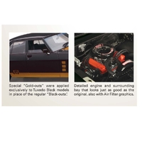 This 1/18 scale replica model is represented in the Tuxedo Black colour scheme. This sleek, deep black finish contributed to the vehicle's distinctive and bold appearance, enhancing its muscular design and complementing features like the refined grille and prominent GTS decals, including special "Gold-outs" instead of the standard "Black-outs" exclusive to the Tuxedo Black models. The HX series offered a range of vibrant colours, with Tuxedo Black standing out as a classic choice among enthusiasts.