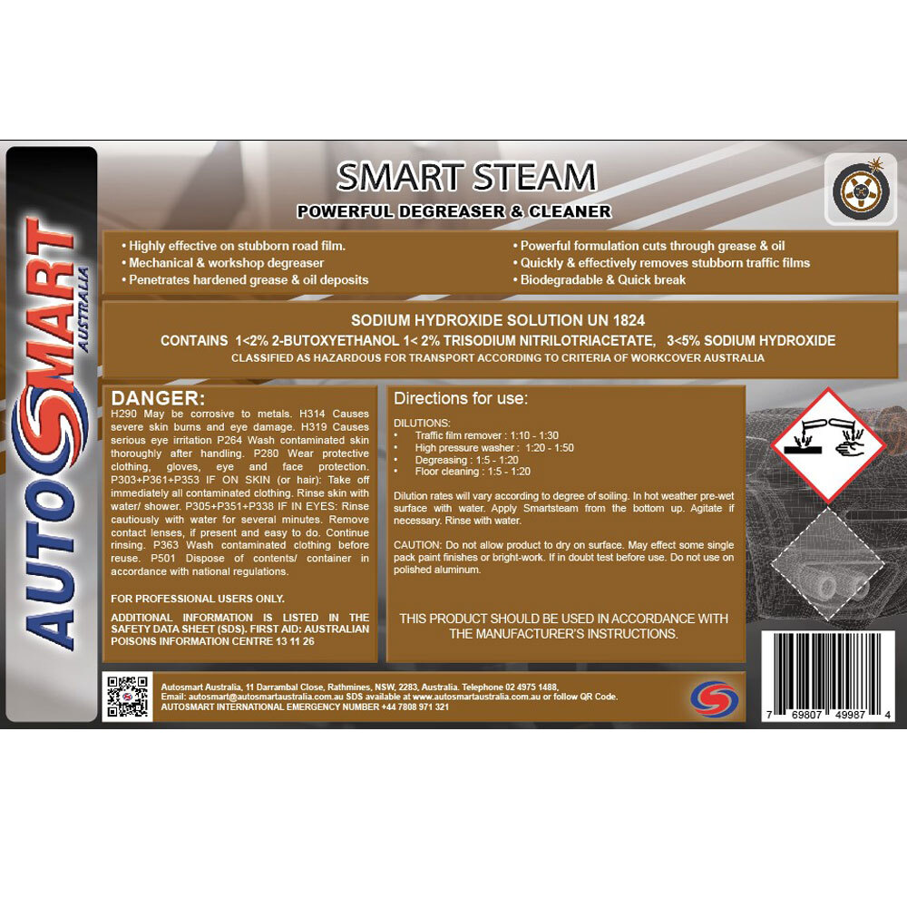 Autosmart Smart Steam is an economical, tough, pre-soak degreaser for automatic car wash system lower panel and tyre spray.